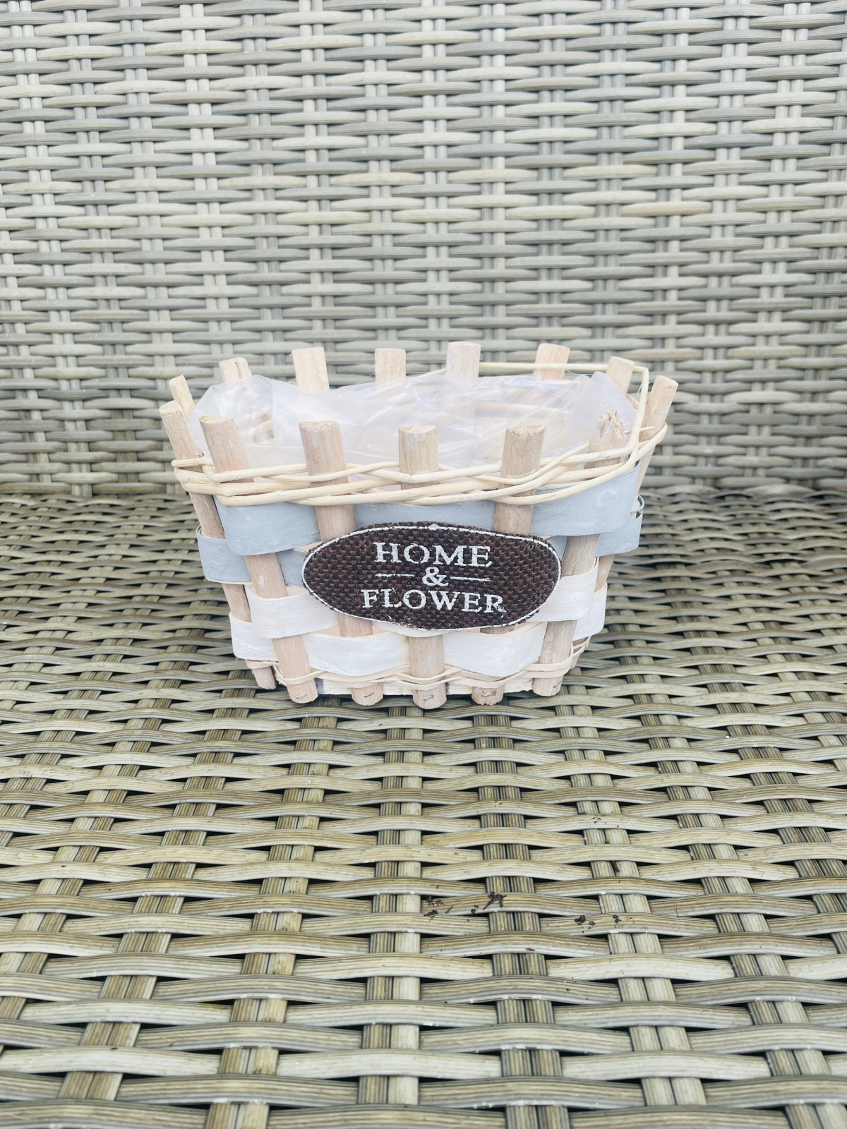 Cos oval din nuiele impletite, captusit la interior cu folie, ideal pentru aranjamente florale.