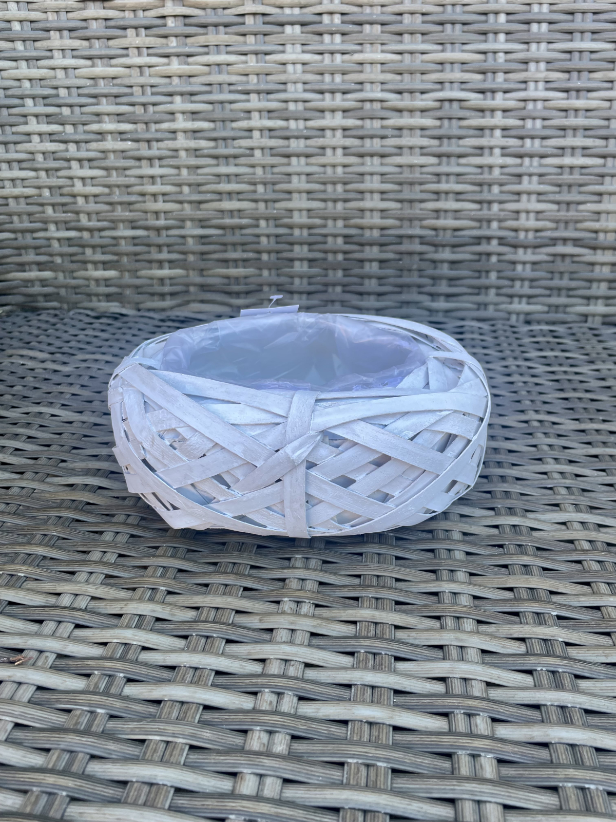 Cos de ratan alb in forma de cuib oval, ideal pentru aranjamente florale.