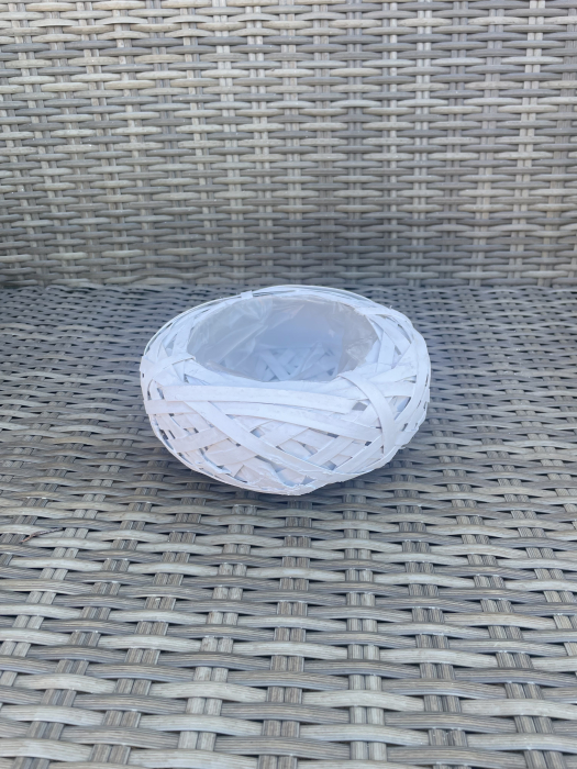 Cos de ratan alb in forma de cuib rotund, ideal pentru aranjamente florale.