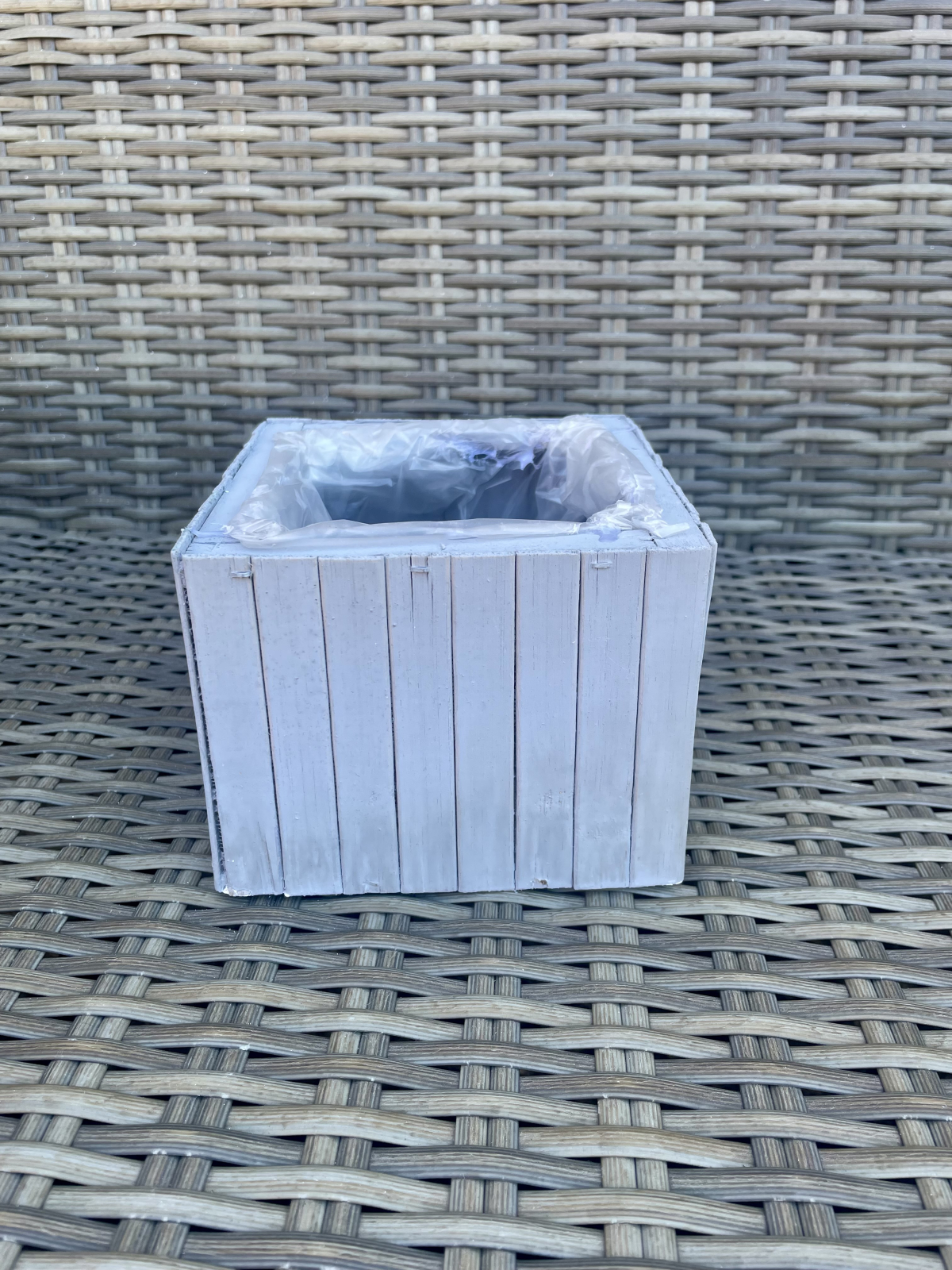 Cutie de lemn patrata vopsita gri captusita la interior cu folie, ideala pentru aranjamente florale.