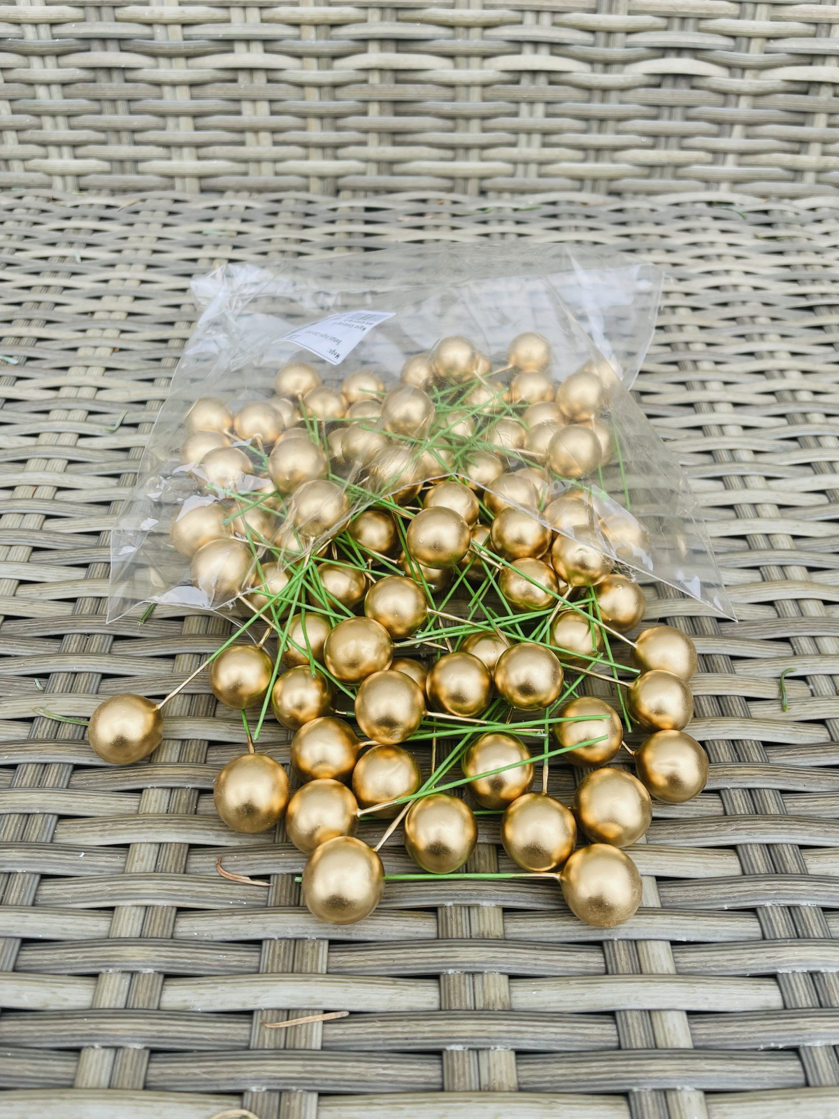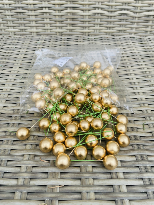Punga cu bobite rosii din polistiren vopsite aurii de 2 cm si tija.