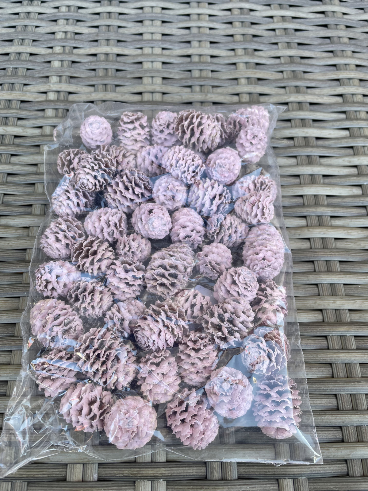 Conuri naturale vopsite roz deschis, ideal pentru aranjamente de Craciun.