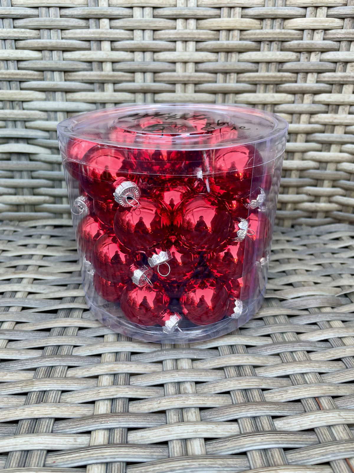 Cutie cu globulete din sticla de 3 cm, culoare mix 5, rosii lucioase cantitate: 45 bucati.