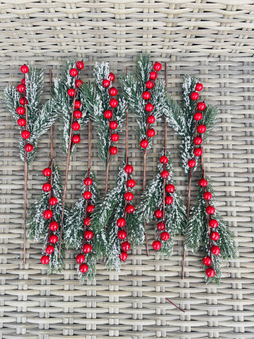 Set de 10 bucati pick-uri cu merisoare rosii si brad artificial, usor nins.
