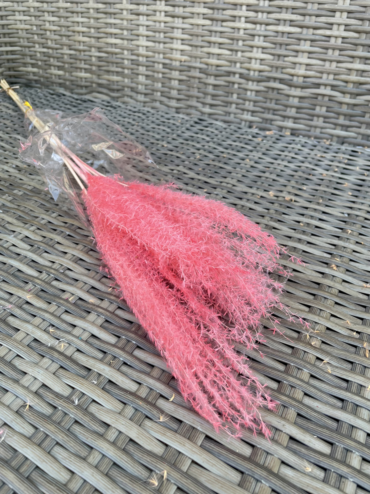 Pachet cu 5 fire de planta mischantus vopsita roz intens. Face parte din categoria pampas si poate fi utilizata in buchete si aranjamente.