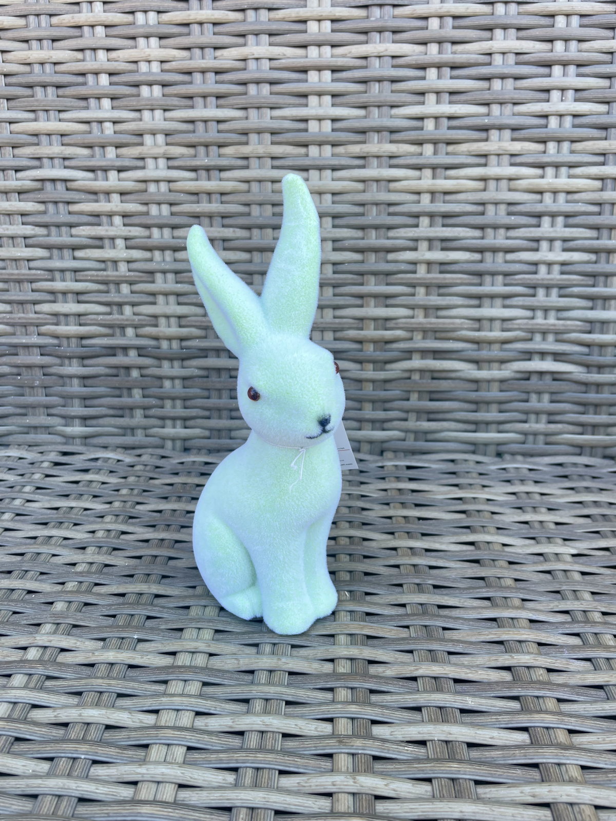 Iepure decorativ din catifea, verde fistic, model in sezut, ideal pentru aranjamentele de Paste si primavara.