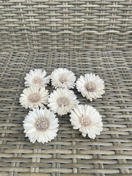 Flori realizate hand-made din material natural, lemn de shola cu textura moale. Nuanta este natur-ivoire, iar dimensiunile capetelor intre 6-7 cm. Se pot atasa tije de sarma floristica si sunt ideale pentru buchete, lumanari si aranjamente florale.