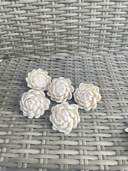 Flori realizate hand-made din material natural, lemn de shola cu textura moale. Nuanta este natur-ivoire, iar dimensiunile capetelor intre 5-7 cm. Se pot atasa tije de sarma floristica si sunt ideale pentru buchete, lumanari si aranjamente florale.